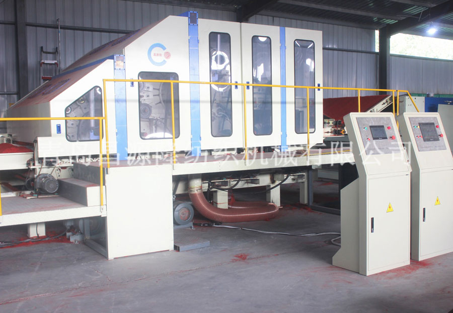 一、高速地毯生產線工藝流程:開包-開鬆機-振動給棉機-梳理機-鋪網機-針刺機-切邊成卷機