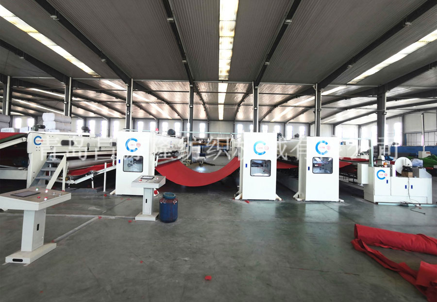 一、新型高產量地毯設備工藝流程:開包-開鬆機-振動給棉機-梳理機-鋪網機-針刺機-切邊成卷機
