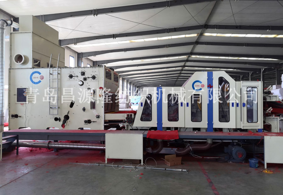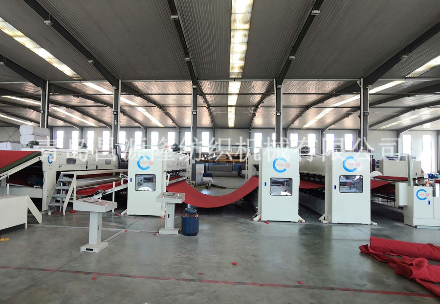 一、一次性地毯生產線工藝流程:開包-開鬆機-振動給棉機-梳理機-鋪網機-針刺機-切邊成卷機