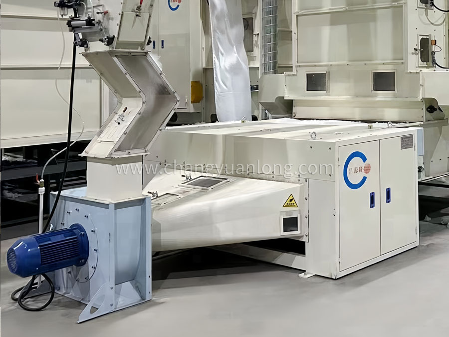 (4)儲棉箱帶強磁鐵除金屬裝置,輸棉風機連接PVC輸棉管道,光滑封閉,不掛棉不漏風。
