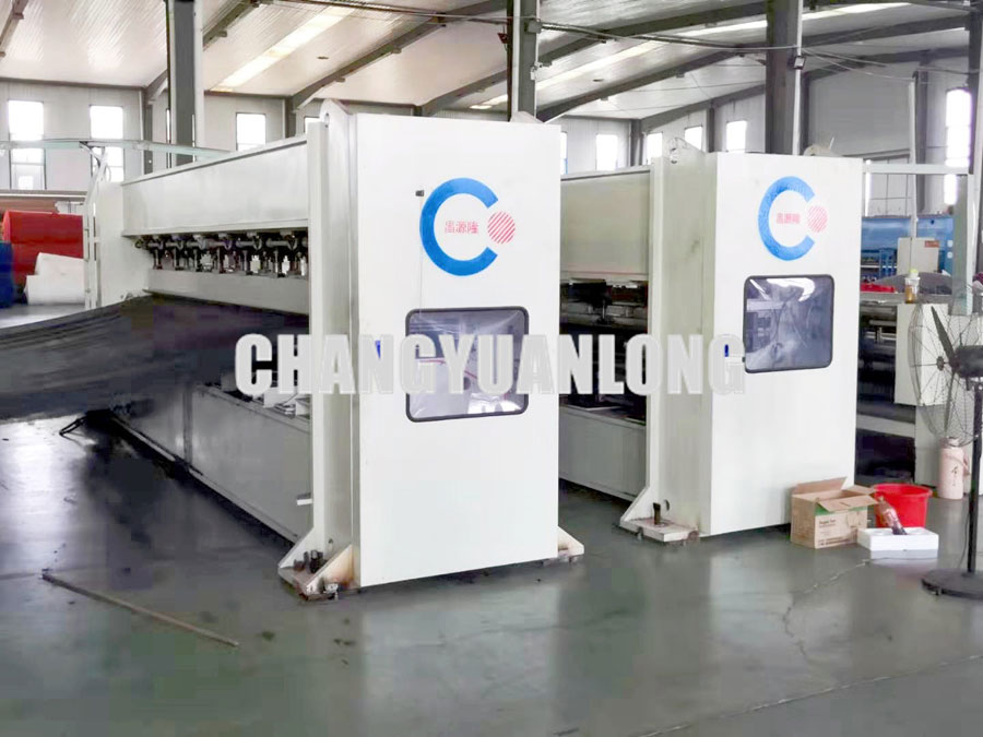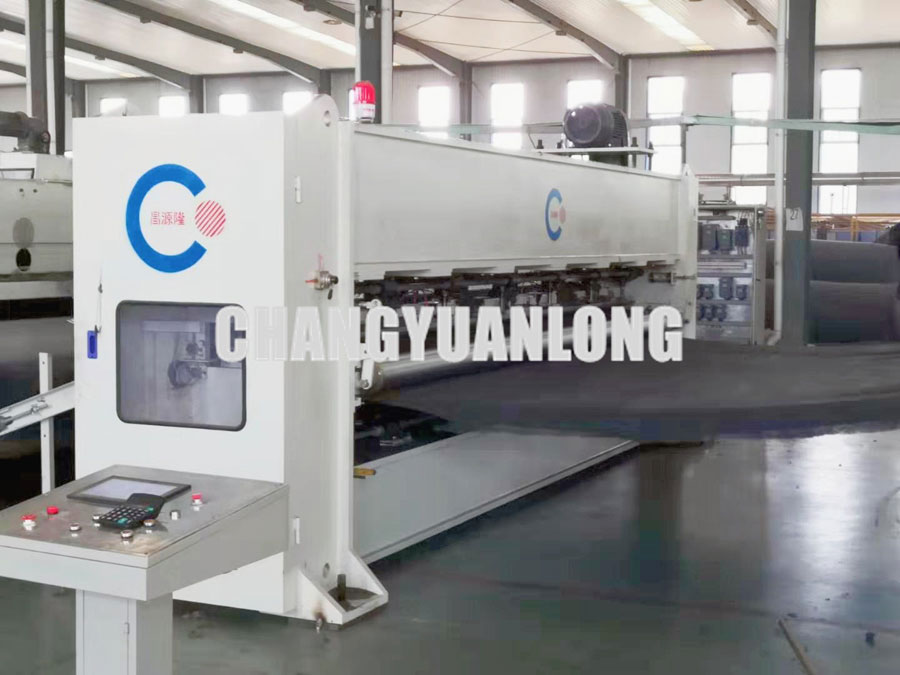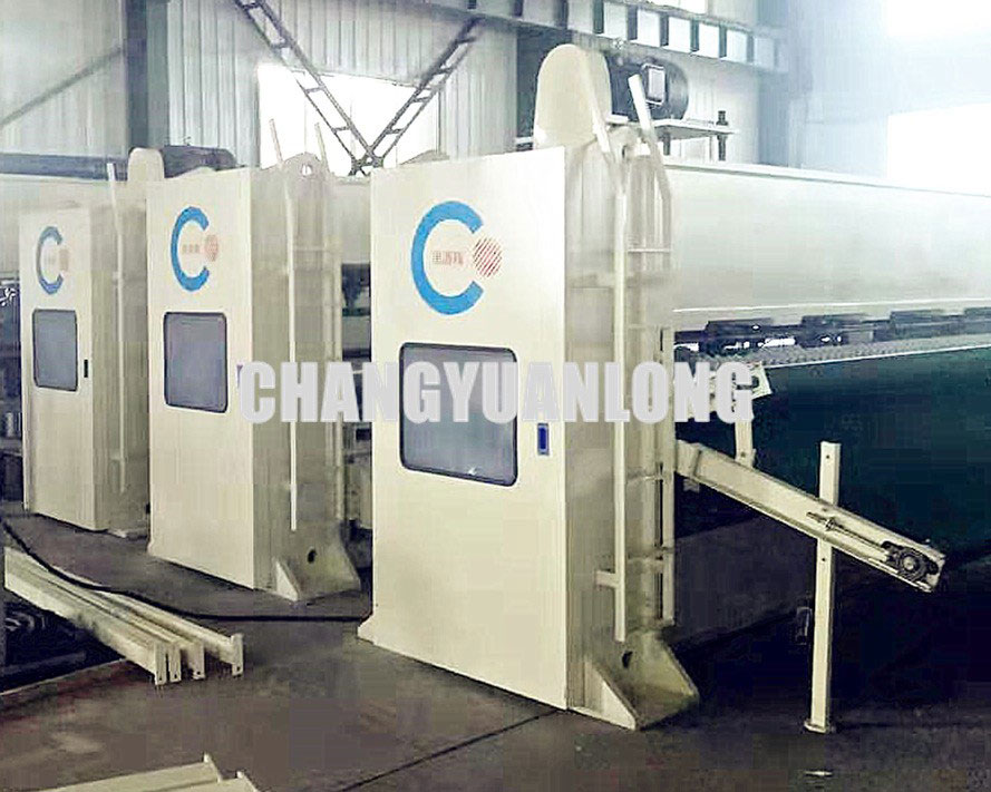鋪網機將鋪好的棉網喂入針刺區,針刺機對蓬鬆棉網進行初加工;由一對輥組成的輸出機構將初步針刺的棉網輸出,